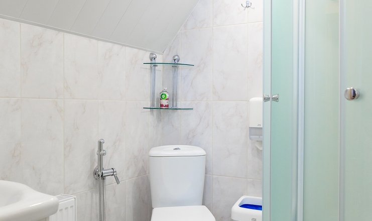 Санузел: душ, раковина, унитаз, тапочки, туалетные принадлежности, фен, халат
