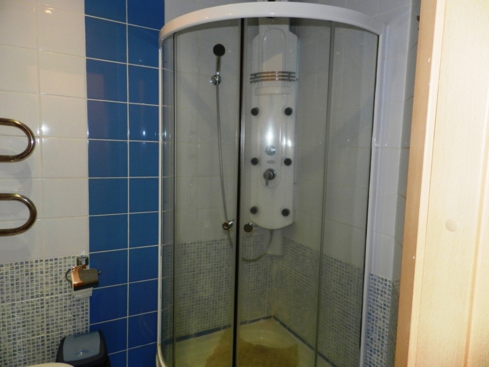 Сан/узел: душевая кабина, унитаз, раковина, туалетные принадлежности.