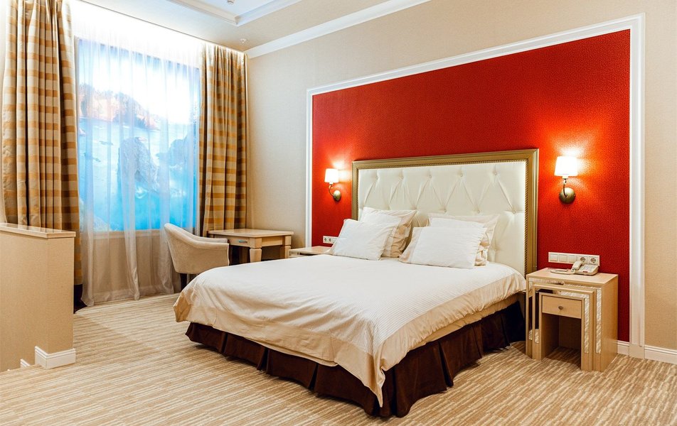 В номере: вешалка, зеркало, диван, кровать двуспальная, прикроватные тумбочки, стол, стулья, шкаф, кондиционер, сейф, телевизор, телефон, холодильник
