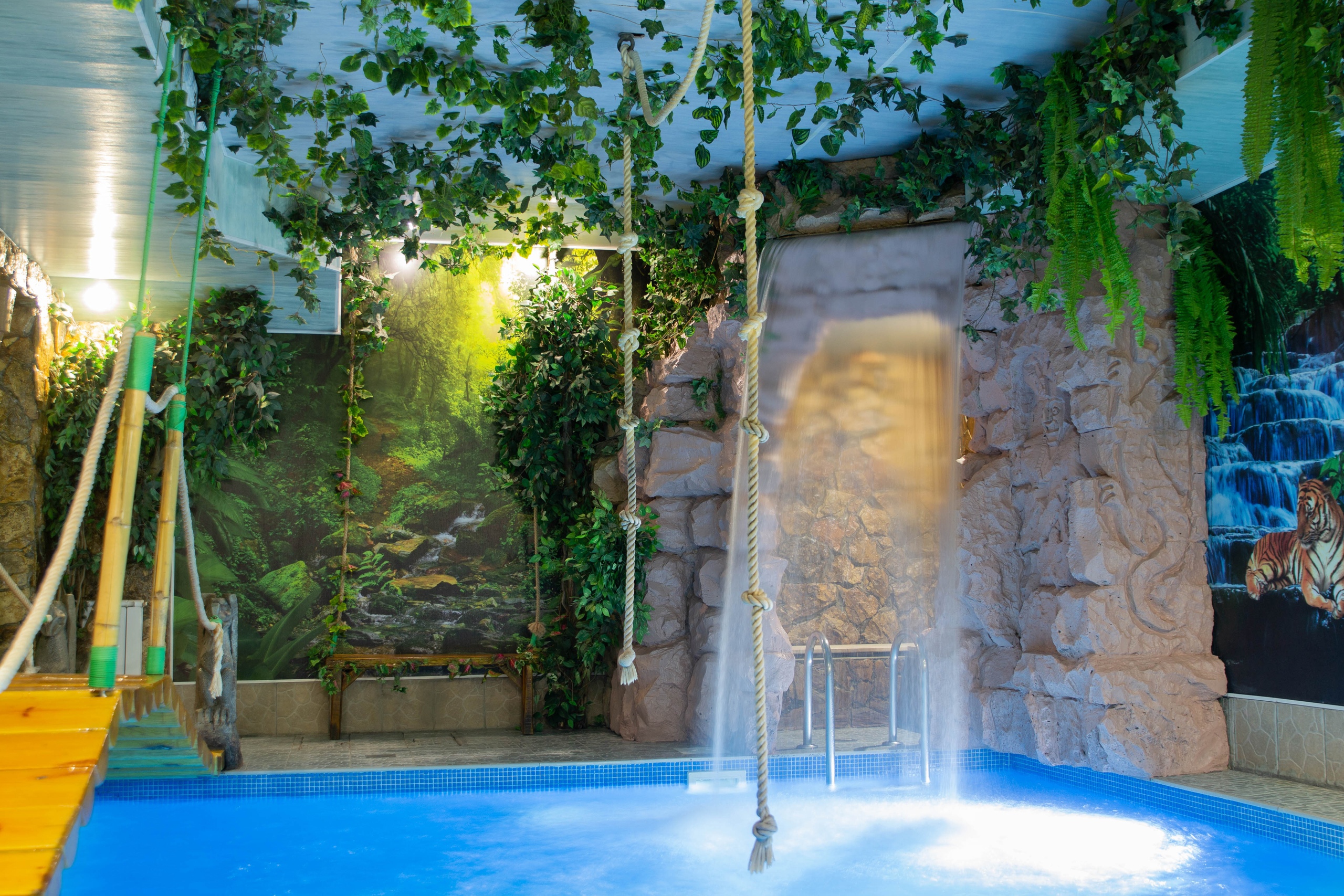Погрузитесь в атмосферу Гавайских островов с успокаивающим двойным гидромассажем, пышной тропической зеленью, большим водопадом, мостиком и двумя тарзанками. Здесь вас ждёт большой (5м х 5м) тёплый (30-32°C) бассейн с чистейшей, гипоаллергенной водой, финская сауна, комната отдыха и просторная обеденная зона. Зал "Джунгли" рассчитан на 8 человек (за дополнительную плату возможно больше).