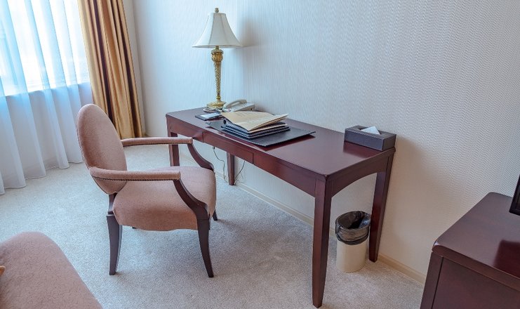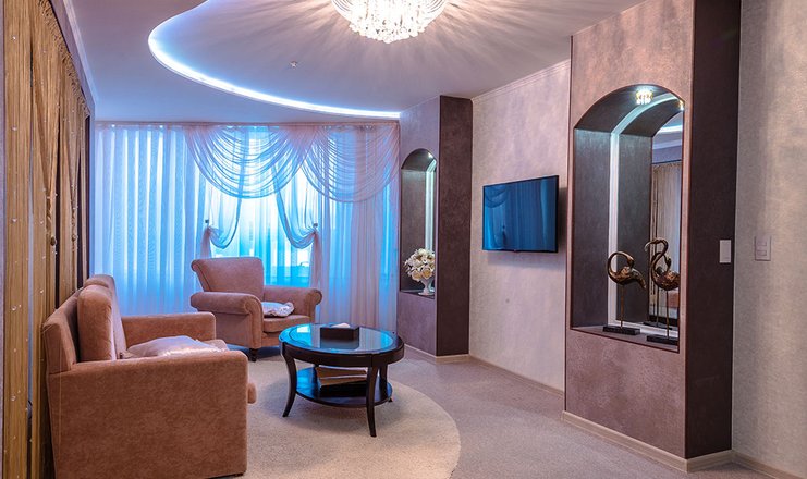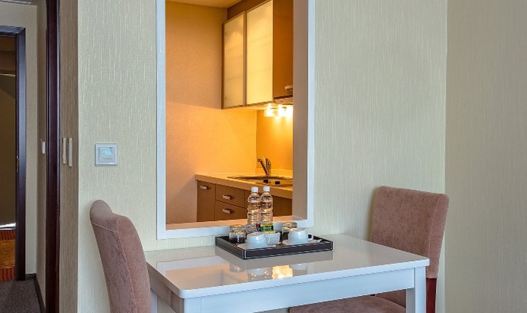В номере: вешалка, зеркало, кровать двуспальная, набор мягкой мебели, прикроватные тумбочки, стол, стулья, шкаф, Мини-кухня, мини-холодильник, сейф, сплит-система, телевизор, телефон, электрочайник