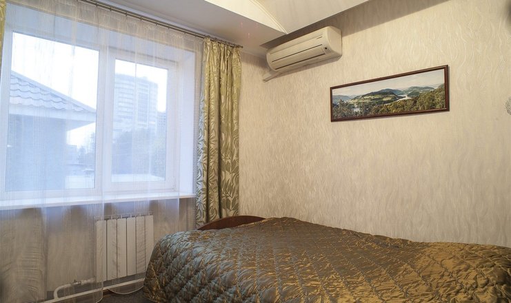 В номере: кровать двуспальная, прикроватные тумбочки, стол, стул, шкаф, кондиционер, набор посуды, телевизор, телефон, холодильник