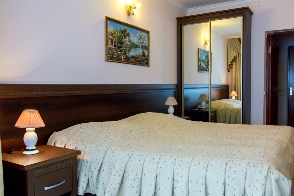 В номере: двуспальная кровать, прикроватные тумбы, стол, стулья, шкаф, холодильник, телевизор, набор посуды