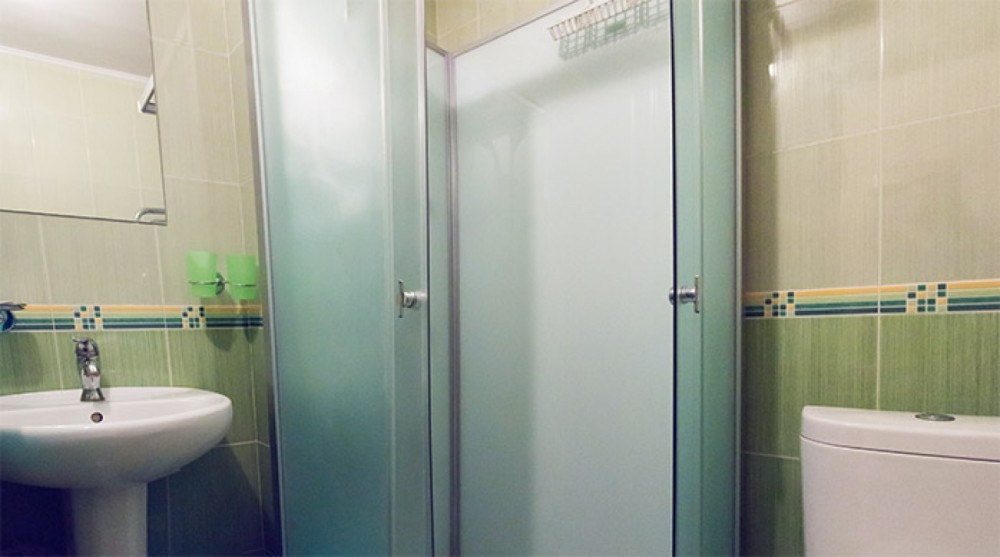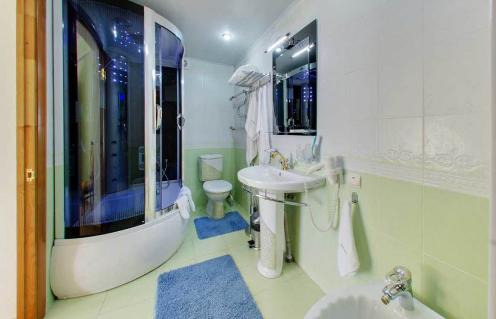 Санузел: унитаз, раковина, душевая кабина, фен