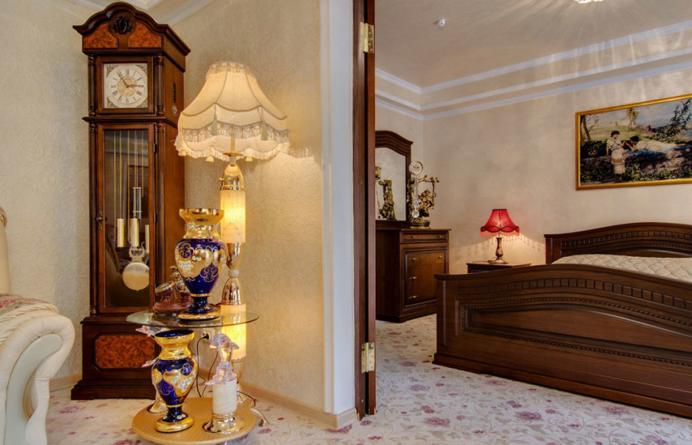 В номере: две комнаты: спальня и гостиная, двуспальная кровать, прикроватные тумбы, посудный шкаф, стол, стулья, комод, пуф, мягкая мебель, шкаф/гардероб, мини-холодильник, телевизор, телефон, кондиционер