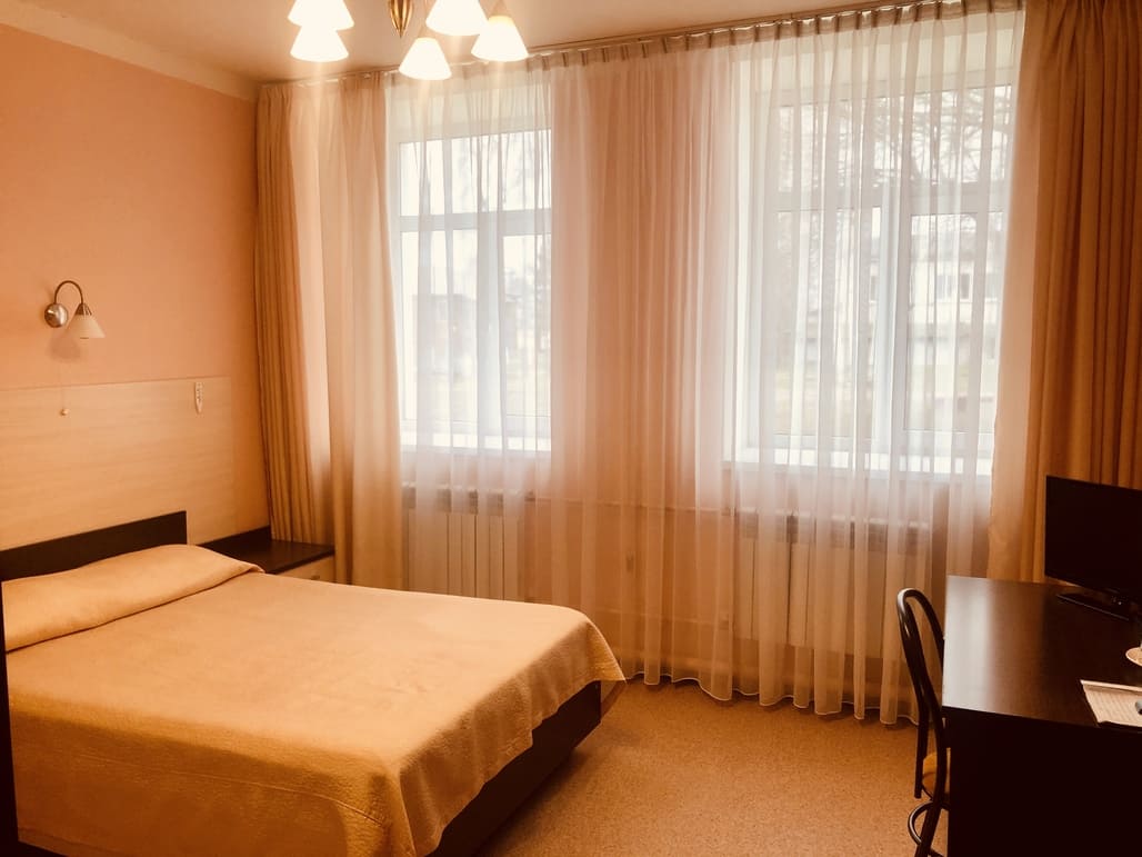 В номере: вешалка, зеркало, кровати односпальные: 2, прикроватные тумбочки, стол, стулья, шкаф, телевизор