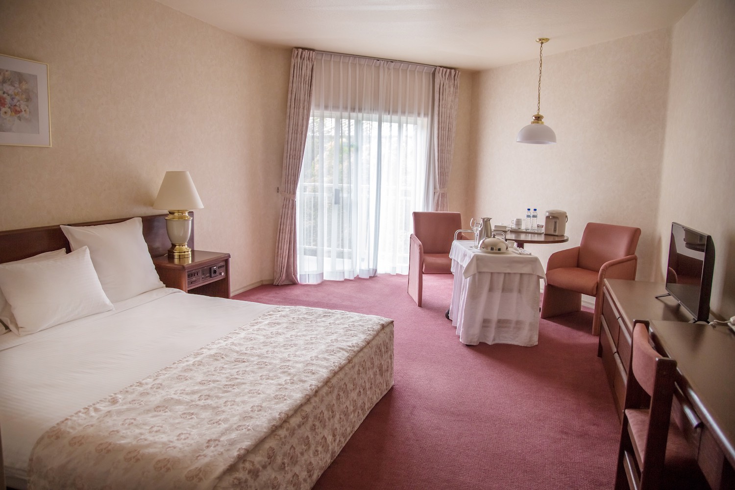 В номере: вешалка, зеркало, кровать двуспальная, прикроватные тумбочки, стол, стулья, шкаф, индивидуальная система обогрева, кондиционер, мини-холодильник, сейф, телевизор, телефон, электрочайник