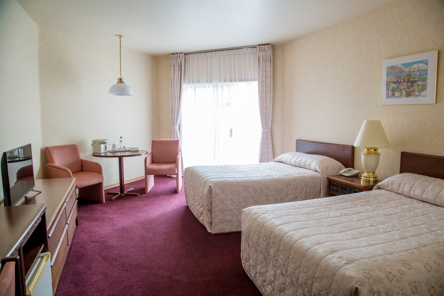 В номере: вешалка, зеркало, кровати полутороспальные, прикроватные тумбочки, стол, стулья, шкаф, индивидуальная система обогрева, кондиционер, мини-холодильник, сейф, сплит-система, телевизор, телефон, электрочайник