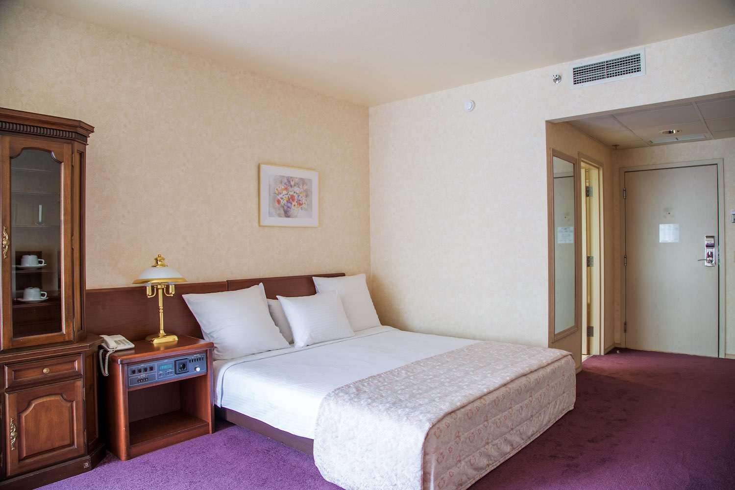 В номере: вешалка, зеркало, кровать двуспальная, прикроватные тумбочки, стол, стулья, шкаф, индивидуальная система обогрева, кондиционер, мини-холодильник, сейф, сплит-система, телевизор, телефон, электрочайник