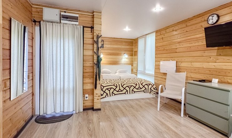 В номере: Кухня, вешалка, зеркало, комод, кровать двуспальная, кухонная мебель, стол, стулья, шкаф, микроволновая печь, набор посуды, телевизор, чайный набор посуды, электрочайник