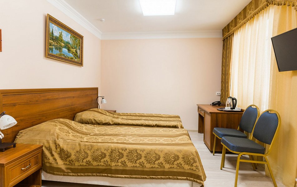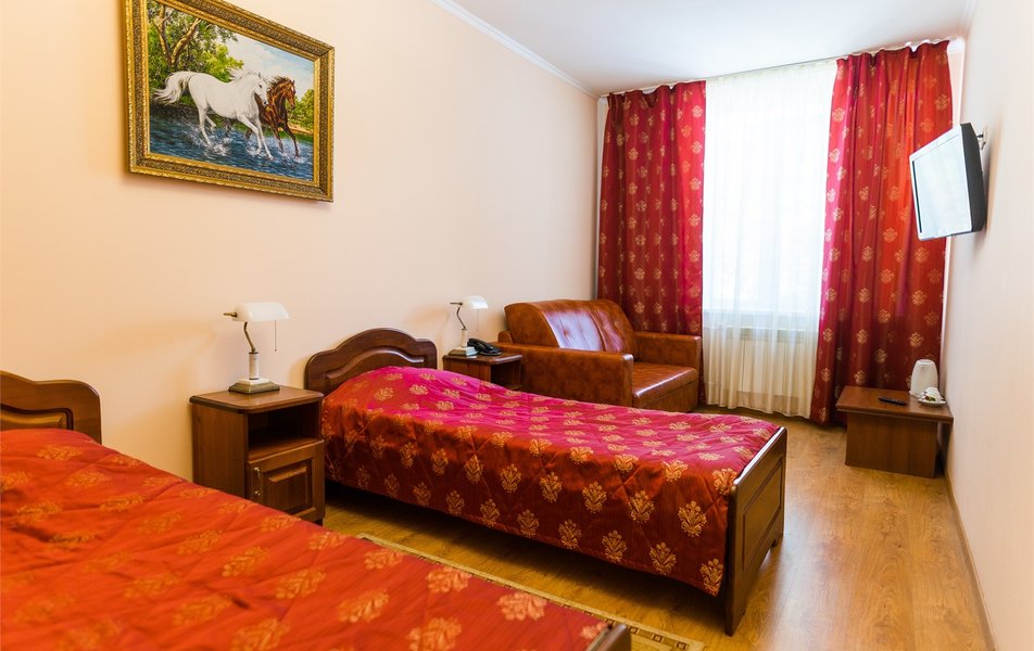 В номере: вешалка, кровати односпальные, прикроватные тумбочки, стол, столик журнальный, стулья, шкаф, сейф, телевизор ЖК, телефон, холодильник, чайный набор посуды, электрочайник