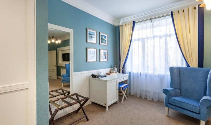 В номере: диван раскладной, зеркало, кресло, кровать двуспальная, прикроватные тумбочки, стол, стулья, тумба багажная, шкаф, кондиционер, мини-холодильник, сейф, телевизор ЖК, телефон, чайный набор посуды, электрочайник