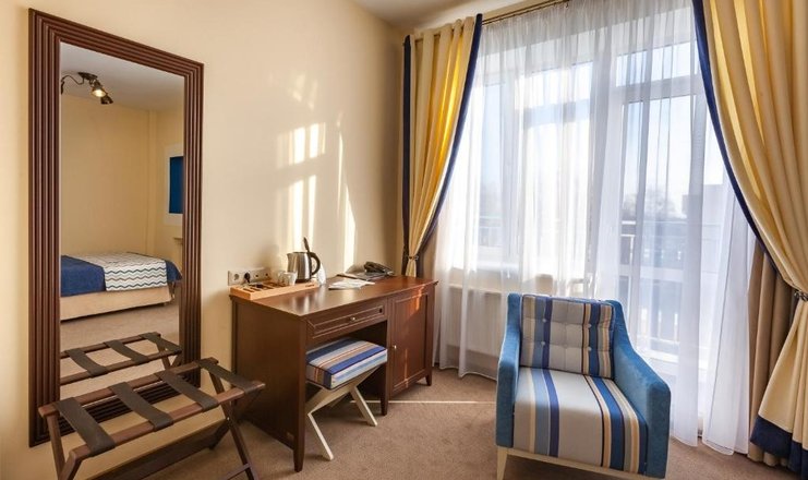 В номере: кровать полутораспальная, прикроватные тумбочки, стол, стулья, шкаф, кондиционер, мини-холодильник, сейф, телевизор ЖК, телефон, чайный набор посуды, электрочайник