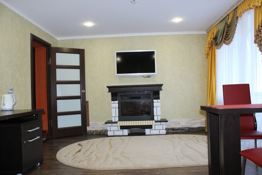 В номере: спальня с двумя 1-но спальными кроватями или одной 2-х спальной, гостиная с мягкой мебелью, набор столовой и чайной посуды, TV, холодильник.